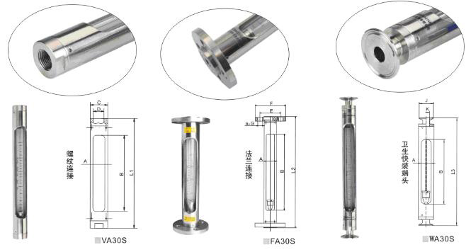 LZB-VA/WA/FA 30S系列玻璃轉子流量計外殼為不銹鋼304材質(zhì),接口有內(nèi)螺紋、活套法蘭、衛(wèi)生型快裝接頭三種規(guī)格連接新形式,產(chǎn)品輕巧美觀適用。