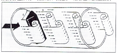 在蒸汽流體中設(shè)置三角柱型旋渦發(fā)生體,則從旋渦發(fā)生體兩側(cè)交替地產(chǎn)生有規(guī)則的旋渦,這種旋渦稱為卡門旋渦,如右圖所示,旋渦列在旋渦發(fā)生體下游非對稱地排列。