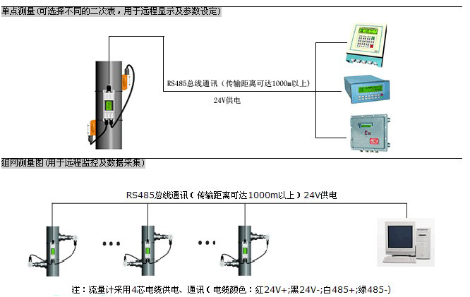 一次表與二次表(或計算機(jī))之間采用RS-485總線通訊,采用普通電纜即可,傳輸距離可達(dá)1000米以上,組網(wǎng)十分方便、快捷。這種傳輸方式抗干擾能力好,解決了分體式超聲波流量計專用電纜成本高、抗干擾能力差、傳輸距離短等問題。
