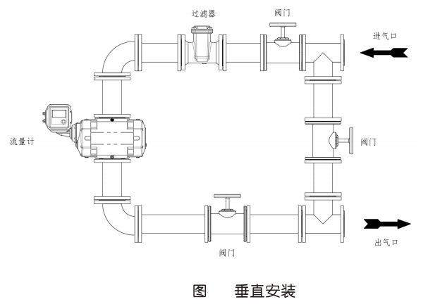垂直安裝(見圖1):當(dāng)垂直安裝時(shí),氣體進(jìn)口端需在上方,氣流由上向下流動,即上進(jìn)下出,建議用戶采用垂直安裝方式,垂直安裝有助于轉(zhuǎn)子對雜質(zhì)的自清潔能力。