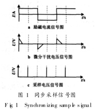 在現(xiàn)行的電磁流量計(jì)設(shè)計(jì)中,低頻矩形波勵(lì)磁方式結(jié)合了直流勵(lì)磁和交流勵(lì)磁兩者的優(yōu)點(diǎn), 成為主要?jiǎng)?lì)磁方式之一。在低頻勵(lì)磁方式下, 其干擾主要表現(xiàn)為: 由勵(lì)磁電流突變產(chǎn)生的微分干擾信號(hào)[ 1] 。理想勵(lì)磁磁場(chǎng)信號(hào)為低頻矩形波, 實(shí)際上隨著勵(lì)磁電流變化 ( dI /dt)在磁場(chǎng)上產(chǎn)生微分干擾信號(hào), 隨著電流的穩(wěn)定, 干擾信號(hào)隨之消失, 因此同步采樣技術(shù)可以有效抑制微分干擾信號(hào)。實(shí)際設(shè)計(jì)中, 模數(shù)轉(zhuǎn)化器使用 AD 公司的 24位 Sigma Delta模數(shù)轉(zhuǎn)化器 AD7714。 AD7714 可以分別采用硬件和軟件方式進(jìn)行采樣開(kāi)始時(shí)間控制, 從而實(shí)現(xiàn)同步采樣。采用軟件方式時(shí), 當(dāng)控制寄存器中FSYNC位為邏輯 1時(shí), 模數(shù)轉(zhuǎn)換器處于復(fù)位狀態(tài); 向該位寫(xiě)邏輯 0時(shí), 器件開(kāi)始采樣輸入信號(hào)。在應(yīng)用中,低頻勵(lì)磁信號(hào)由 M SP430單片機(jī)內(nèi)部定時(shí)器產(chǎn)生, 同時(shí)產(chǎn)生采樣信號(hào)。如圖 1所示, 采樣開(kāi)始時(shí)間滯后勵(lì)磁信號(hào)14 個(gè)周期。