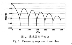式中: fs為采樣頻率; AD7714采樣頻率為 1912 kHz ; N為濾波采樣個(gè)數(shù); f 為數(shù)字濾波器響應(yīng)頻率。通過(guò)設(shè)定濾波采樣個(gè)數(shù)可以改變數(shù)字濾波器的截止頻率和一次陷波頻率。在本設(shè)計(jì)中綜合考慮模數(shù)轉(zhuǎn)換速度和去除噪聲性能, 設(shè)置 N 值使濾波器截止頻率為 50 Hz, 濾波器頻域響應(yīng)如圖 2所示, 濾波器對(duì)工頻 50 Hz及其偶次諧波有很好的抑制作用。
