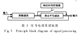 泥漿干擾是在測(cè)量泥漿、纖維漿等固液兩相特性液體時(shí), 固體顆粒或者氣泡與電極發(fā)生摩擦, 在電極表面的電化學(xué)電動(dòng)勢(shì)突然變化, 電磁流量計(jì)傳感器輸出信號(hào)輸出尖峰脈沖狀干擾。在低頻勵(lì)磁情況下, 泥漿干擾產(chǎn)生的尖脈沖數(shù)量級(jí)大, 極大地影響流量的準(zhǔn)確測(cè)量,在實(shí)際設(shè)計(jì)中,采用多種信號(hào)處理混合方式抑制噪聲,信號(hào)處理原理如圖 3所示。