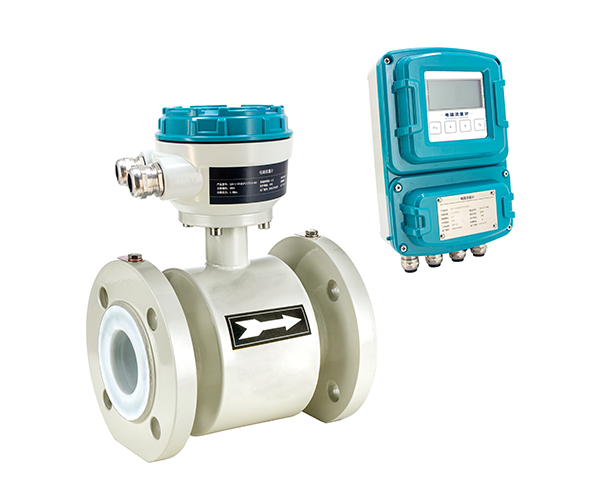 分體管道式電磁流量計由流量傳感器和轉(zhuǎn)換器兩大部分組成。測量管上下裝有勵磁線圈,通勵磁電流后產(chǎn)生的磁場穿過測量管,一對信號電極裝在測量管內(nèi)壁與液體相接觸,產(chǎn)生感應(yīng)電勢,將流量信號傳送到轉(zhuǎn)換器。