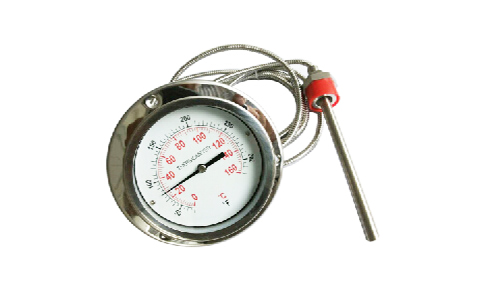 利用感溫包中液體受熱膨脹而使彈性元件產(chǎn)生偏轉(zhuǎn)來帶動度盤轉(zhuǎn)動指示出被測介質(zhì)的溫度。