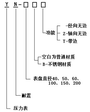 選型說明:功能選型中“T”僅適用于Φ60 Φ100 Φ150表盤的壓力表