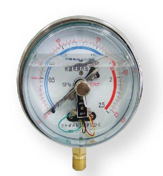 在電接點(diǎn)壓力表裝置的電接觸信號針上,裝有可調(diào)節(jié)的永久磁鋼,可以增加接點(diǎn)吸力,加快接觸動作,從而使觸點(diǎn)接觸可靠,消除電弧,能有效的避免儀表由于工作環(huán)境振動或介質(zhì)壓力脈動造成觸點(diǎn)的頻繁關(guān)斷。所以電接點(diǎn)壓力表具有動作可靠、使用壽命長、觸點(diǎn)開關(guān)功率較大等優(yōu)點(diǎn)。